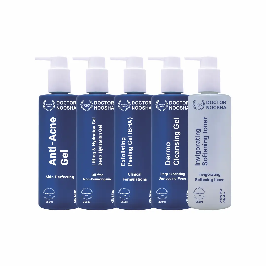 پکیج کامل پوست چرب دکتر نوشا شامل ژل درموکلینزینگ، ژل آبرسان و لیفتینگ، ژل پیلینگ BHA، ژل ضد جوش و تونر اکتیو پلاس است. هر محصول با فرمولاسیونی ویژه برای رفع مشکلات پوست چرب طراحی شده است و با استفاده از ترکیبات موثر، به سلامت و تعادل پوست شما کمک می‌کند.